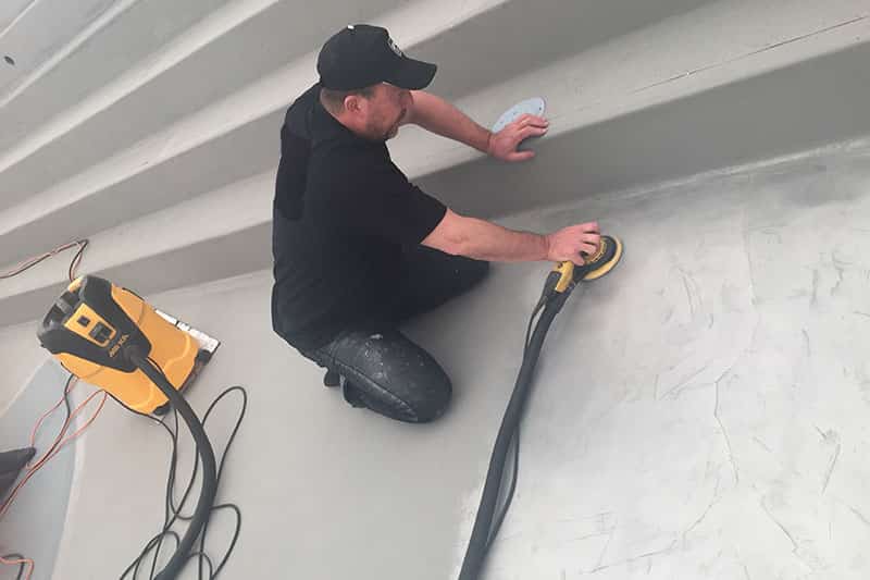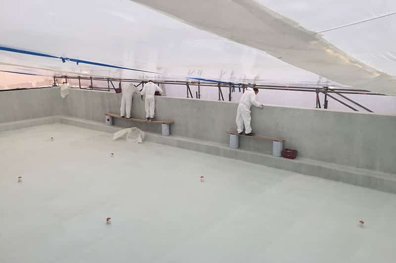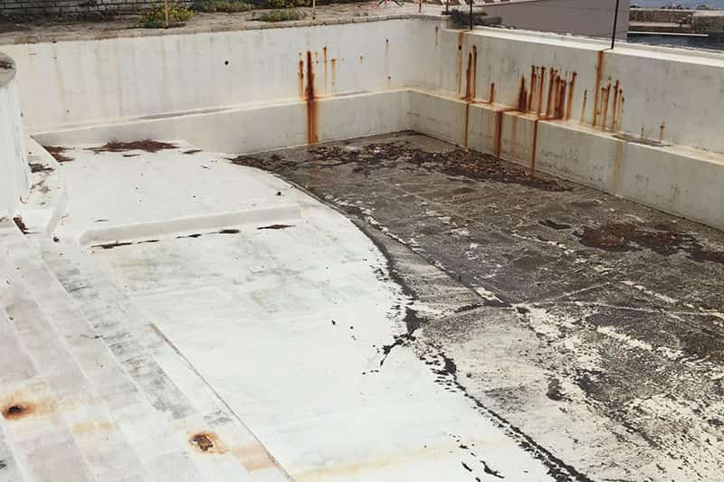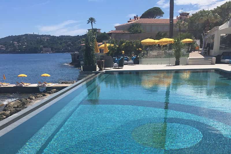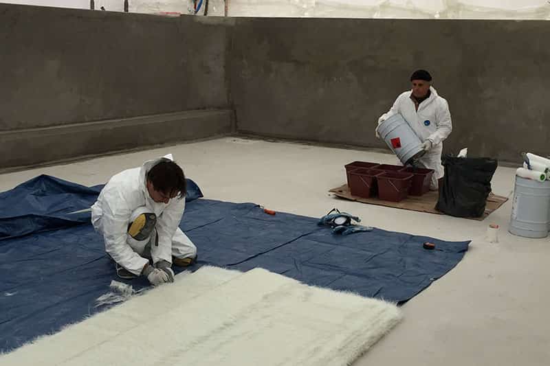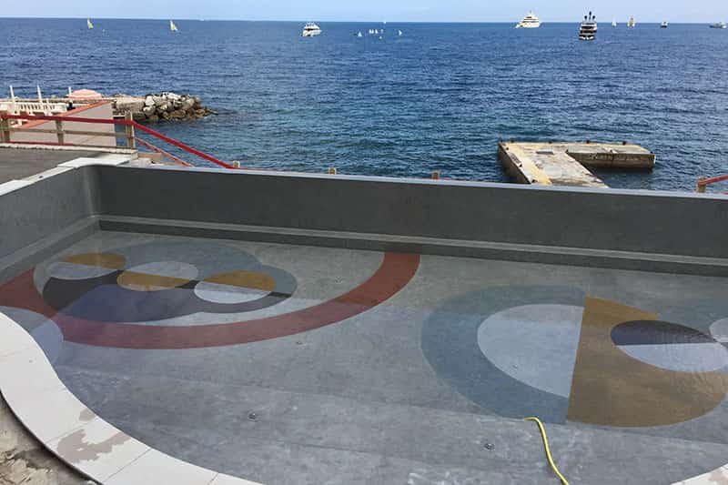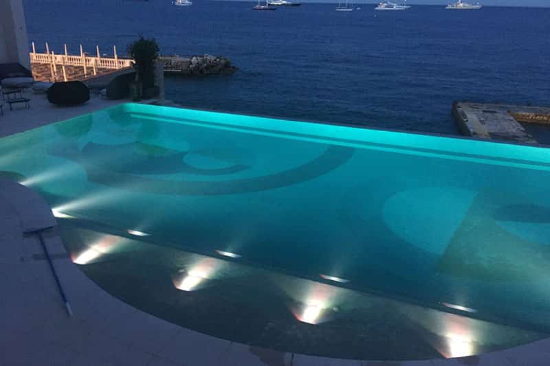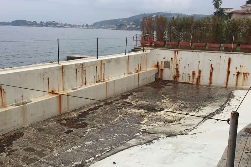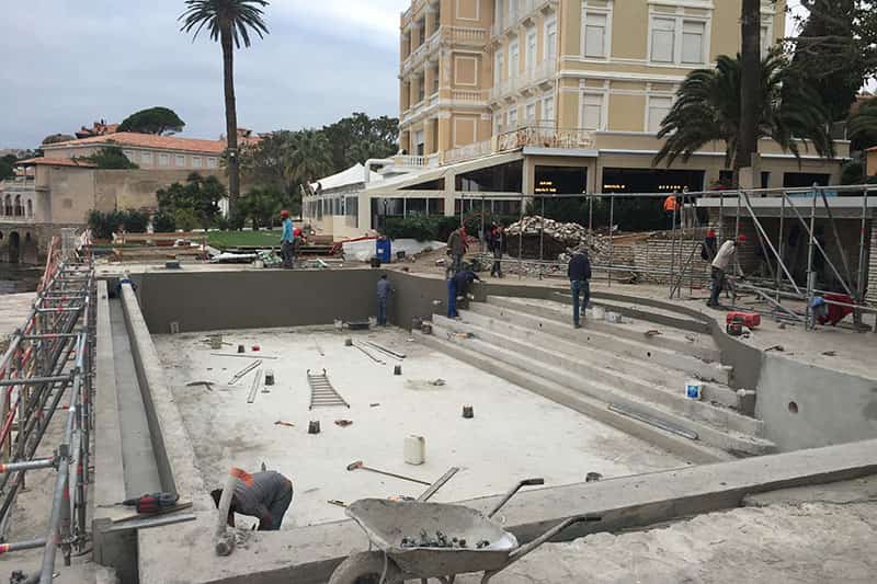 Ci-dessus : Chantier de rénovation et de métallisation du fond de la piscine à débordement de 360m2 d'un hôtel 5 étoiles à Côte de Monaco.Toute la Piscine est métallisée en étain.