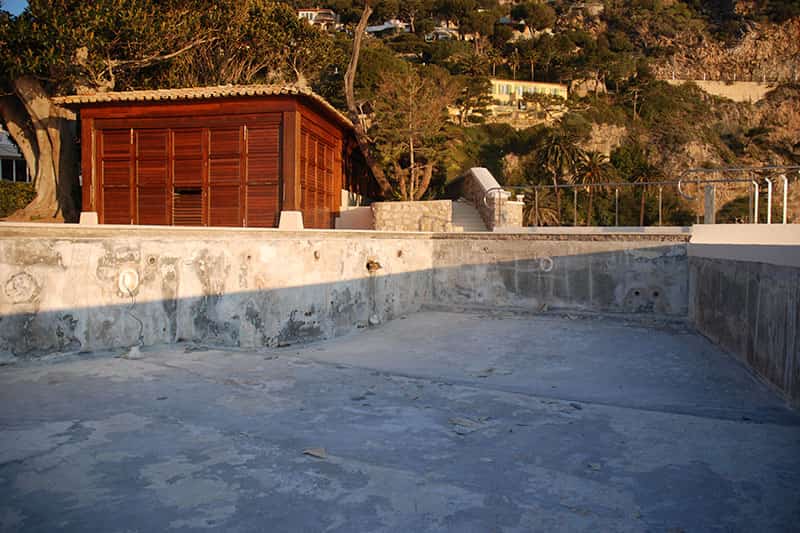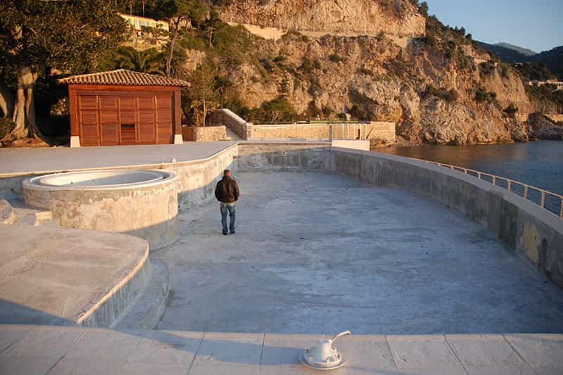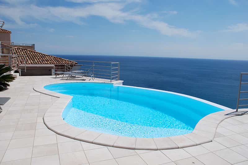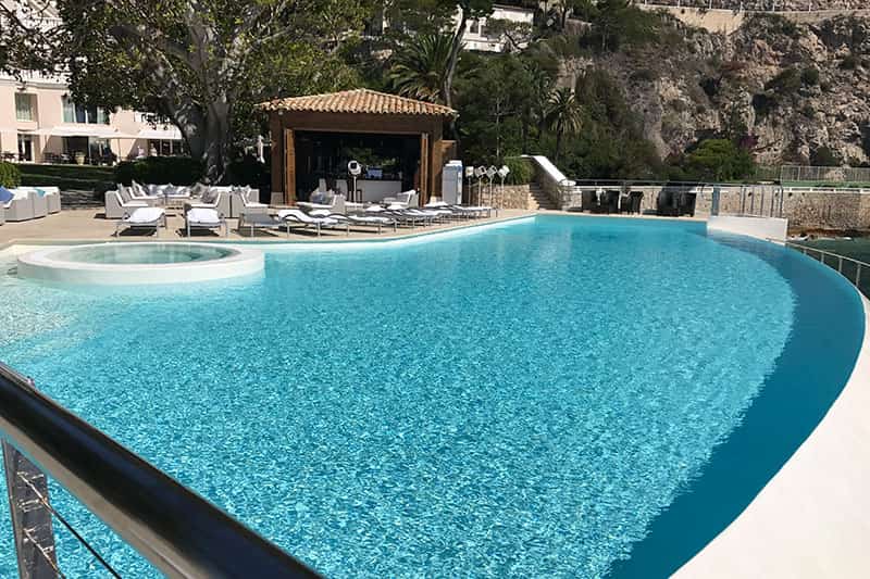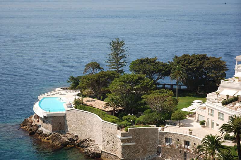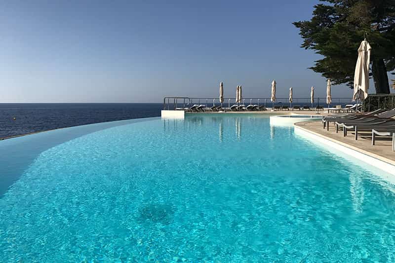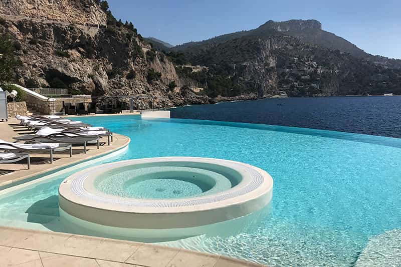 Ci-dessus, Piscine de l'hôtel, Le Cap Estel***** à Eze -Monaco : 820 m2 avec débordement, réalisée en fibre de verre armée et résine polyester isophalique.